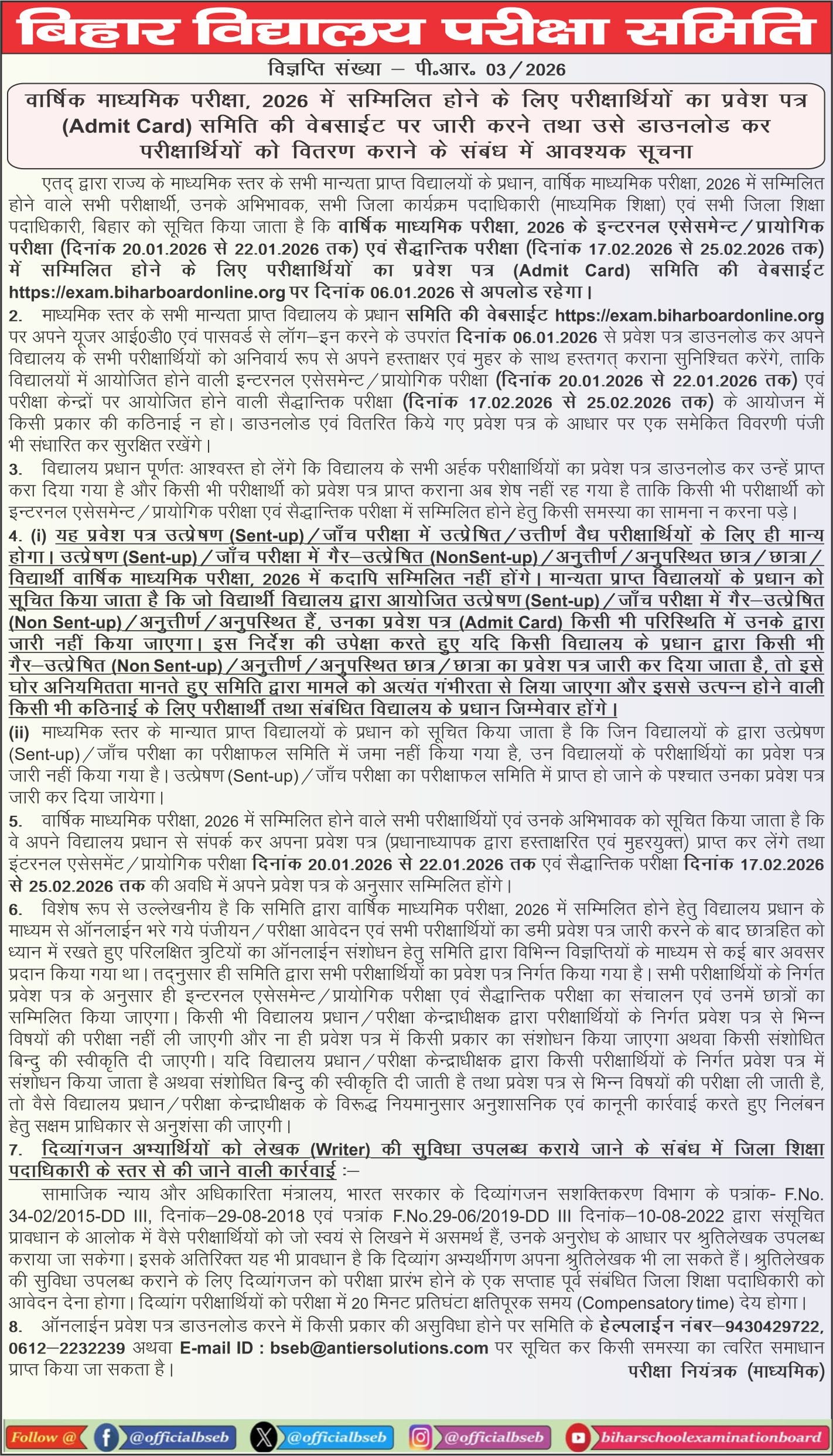 बिहार विद्यालय परीक्षा समिति (बीएसईबी) द्वारा जारी एक आधिकारिक अधिसूचना के अनुसार, बोर्ड ने 6 जनवरी, 2026 से स्कूलों के लिए कक्षा 10 (मैट्रिक) वार्षिक परीक्षा 2026 के एडमिट कार्ड जारी कर दिए हैं।
