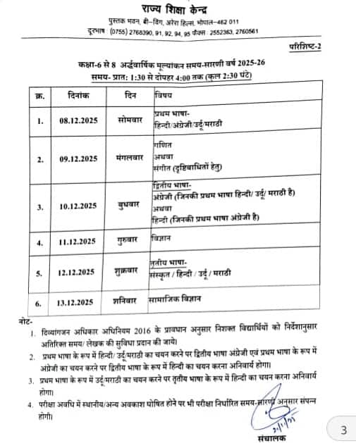 बोर्ड ने हाल ही में अर्धवार्षिक परीक्षाओं के लिए संशोधित कार्यक्रम जारी किया, जो 20 नवंबर से 2 दिसंबर तक आयोजित की जा रही है। छात्रों को बोर्ड परीक्षा 2026 में न्यूनतम 33% अंक प्राप्त करने होंगे और परीक्षाएं ऑफ़लाइन होंगी।