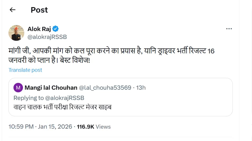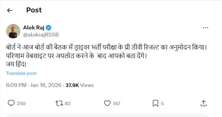 राजस्थान कर्मचारी चयन बोर्ड द्वारा राजस्थान वाहन चालक/ड्राइवर भर्ती रिजल्ट आज 16 जनवरी को घोषित किए जाने की उम्मीद है। लिखित परीक्षा में शामिल हुए उम्मीदवार रिजल्ट जारी होने के बाद आधिकारिक वेबसाइट rssb.rajasthan.gov.in पर इसे देख और डाउनलोड कर सकेंगे।